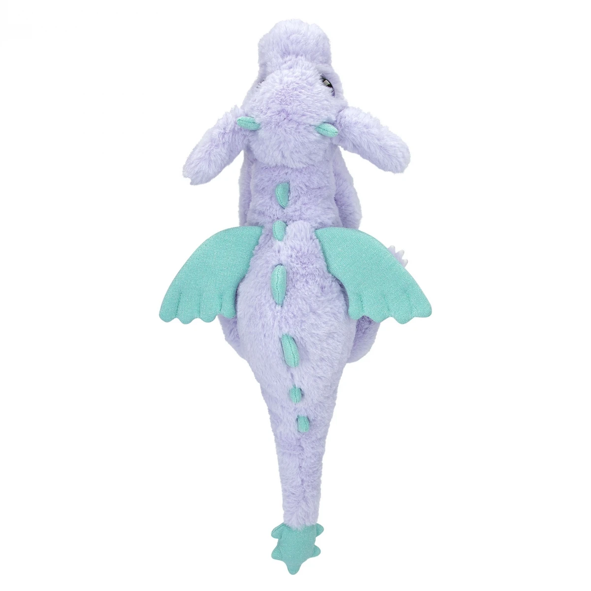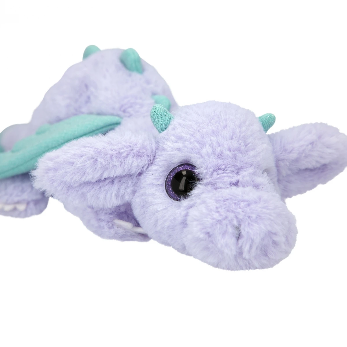 Der lilane Plüschdrache von TOPModel hat türkise Glitzerflügel und lilafarbene Glitzeraugen aus Kunststoff.
