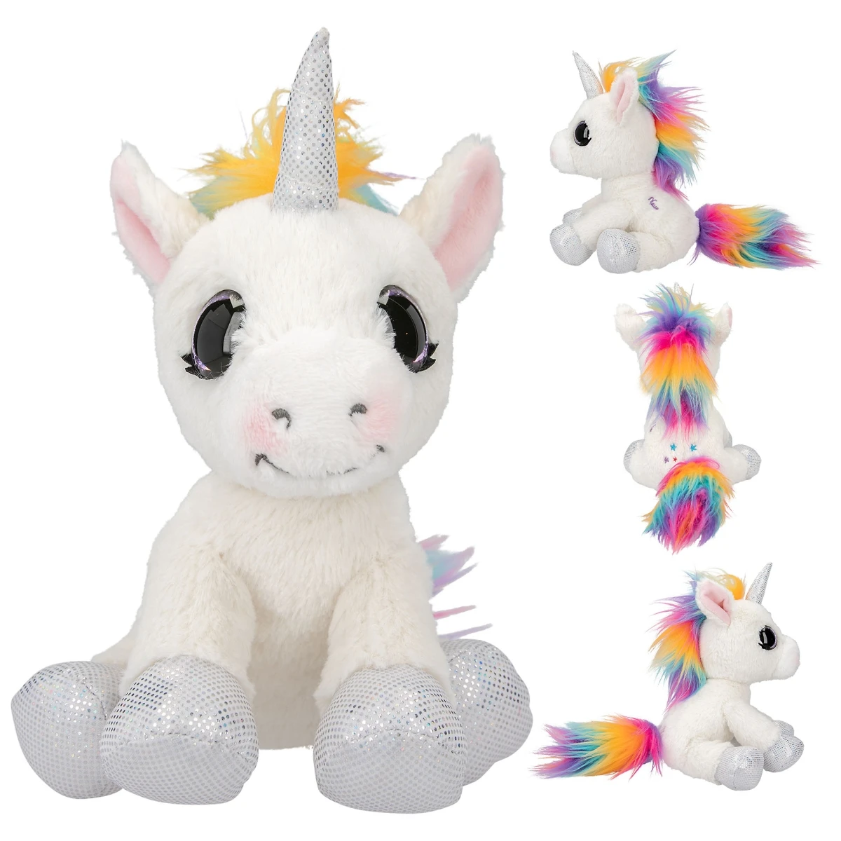 Märchenhaft kuschelig: Das weiße Plüsch-Einhorn Naya hat eine bunte Regenbogenmähne, lila Glitzeraugen und Glitzer-Hufe und -Horn in Silber.